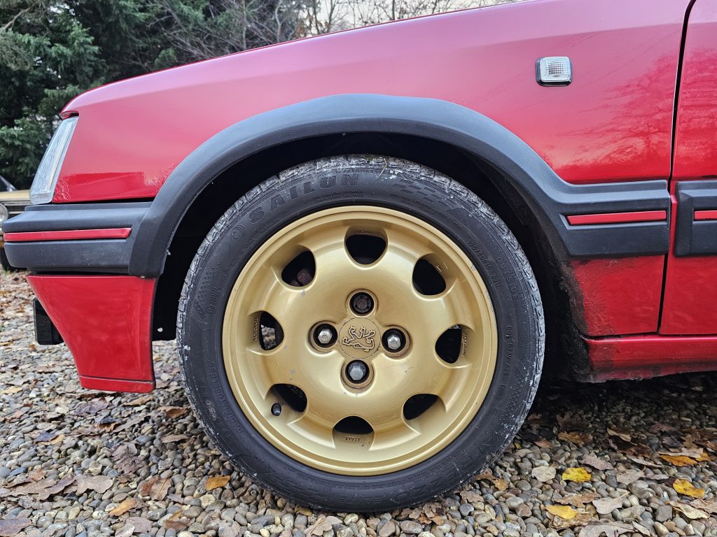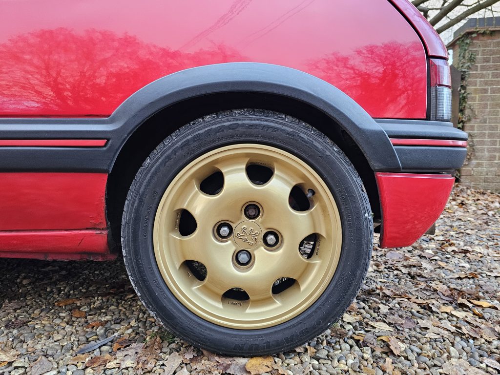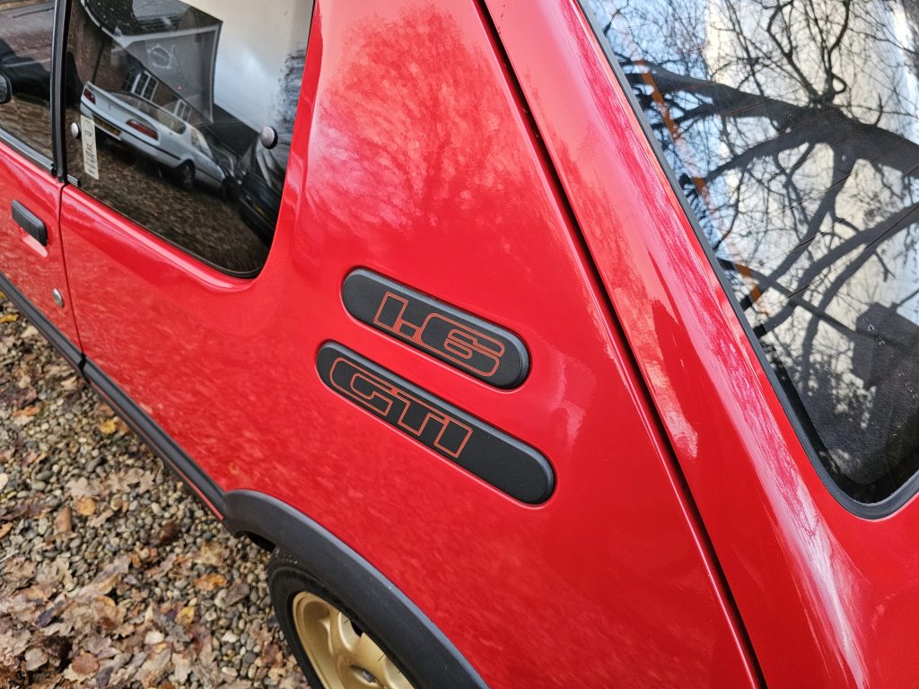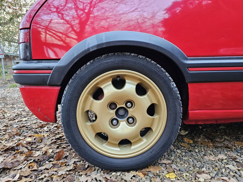 It handles well too having been fitted with 30mm lowering springs and a front strut brace, it is also fitted with 1.9 GTi Speedline wheels which are finished in gold, and compliment the red exterior nicely.
